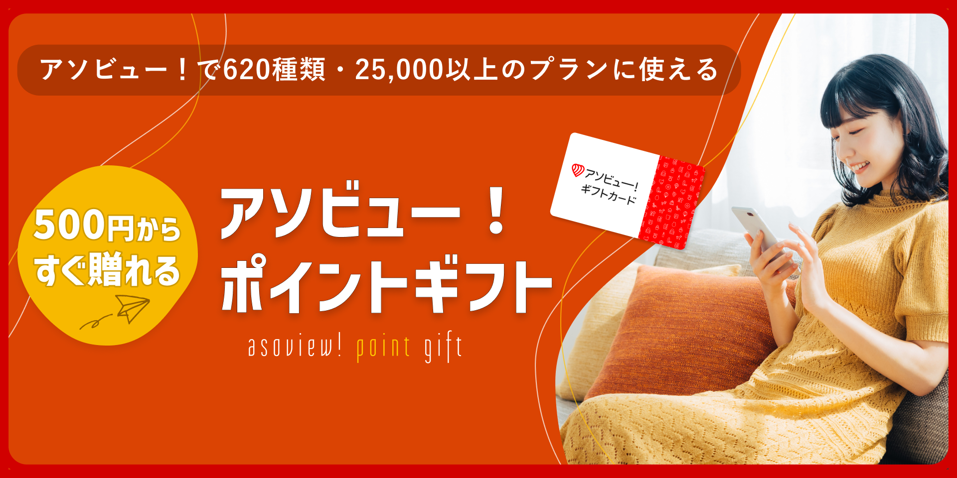 日本全国の遊び・体験を集めた予約サイト「アソビュー!」で使えるデジタルポイントギフトです。アソビュー!ポイントは、全国620ジャンル・25,000以上のプランでご利用いただけます。