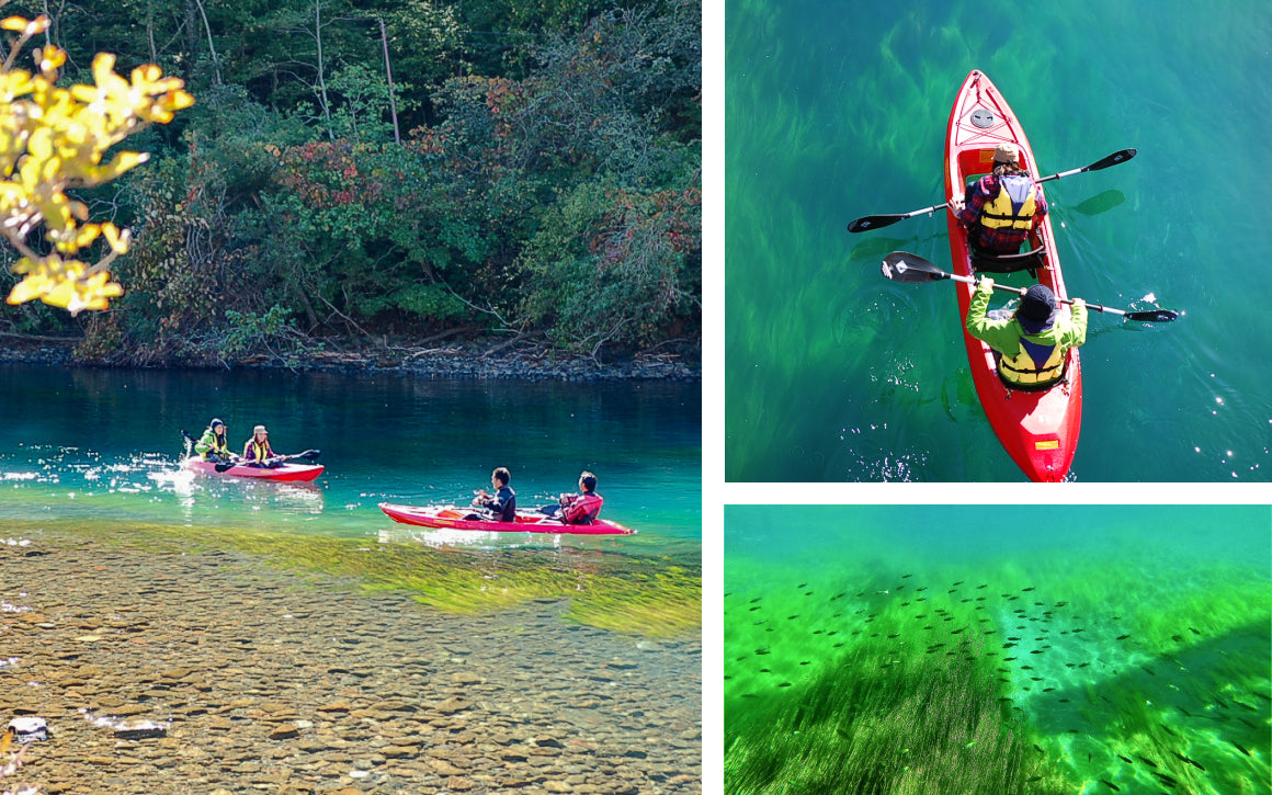 クリアカヤックに乗って、遠景にそびえる山々や緑鮮やかな木々、足元に広がる湖底の青色を眺めながら、まったり癒しのひと時をお過ごしください。