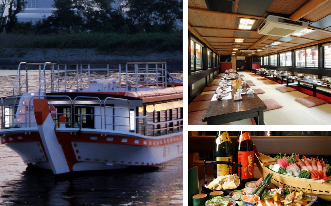 船内の座敷でしっとり呑みながら夜景を楽しむも良し、スカイデッキで夜風に当たりながらゴージャスな眺望を味わうも良し、大江戸の屋形船がお客様に最上のナイトクルージングを演出いたします。