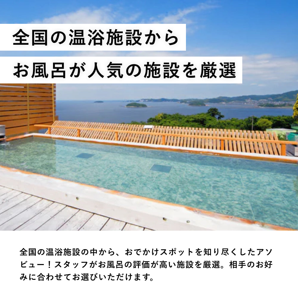 全国の温浴施設の中から、おでかけスポットを知り尽くしたアソビュー!スタッフがお風呂の評価が高い施設を厳選。絶景を眺めながら入浴できる施設や泉質が自慢の施設など、お好みに合わせてお選びいただけます。
