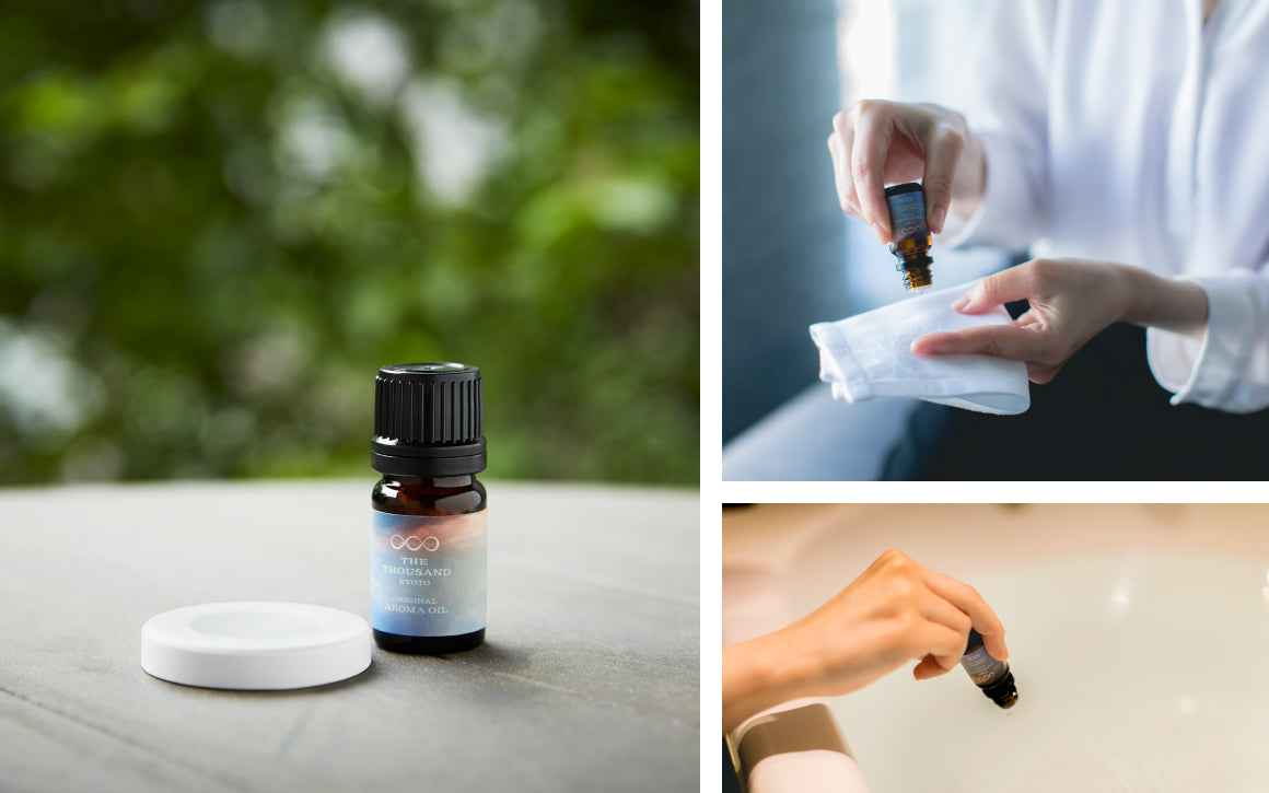 ヒノキやペパーミントなどをTHE THOUSAND KYOTOのイメージに合わせて調合したオリジナルアロマとオイルストーンのセット。