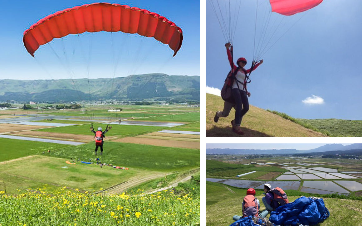 阿蘇山や北外輪山に囲まれた大自然の中、斜面からふわっと飛び立つパラグライダー体験。