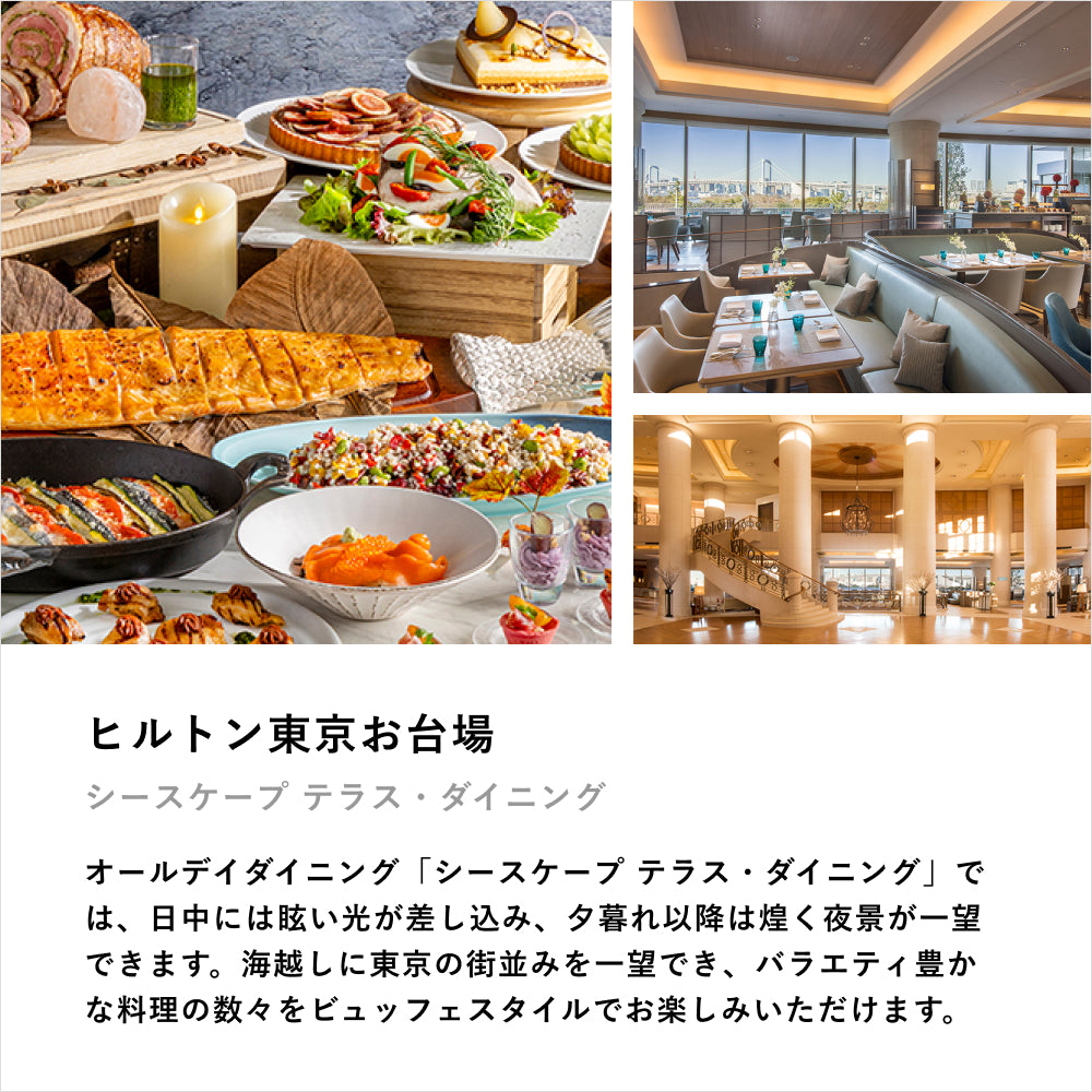 ゆりかもめ「台場駅」直結「ヒルトン東京お台場」内に併設されたオールデイダイニング「シースケープ テラス・ダイニング」。