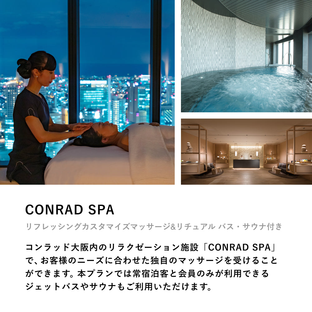コンラッド大阪内にあるリラクゼーション施設「CONRAD SPA」。広々とした個室で、ひとりひとりに合った手法やトリートメントを組み合わせた施術を受けられます。