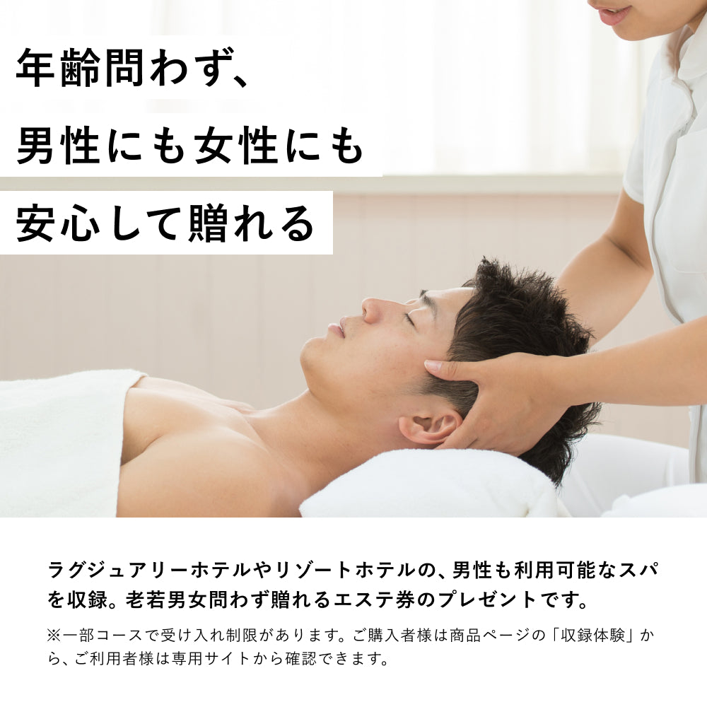 ラグジュアリーホテルやリゾートホテルの、男性も利用可能なスパを収録。老若男女問わず贈れるエステ券のプレゼントです。
