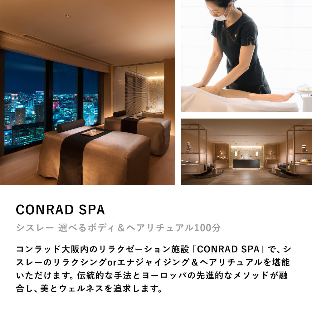 コンラッド大阪内のリラクゼーション施設「CONRAD SPA」で、シスレーのリラクシングorエナジャイジング&ヘアリチュアルを堪能いただけます。伝統的な手法とヨーロッパの先進的なメソッドが融合し、美とウェルネスを追求します。