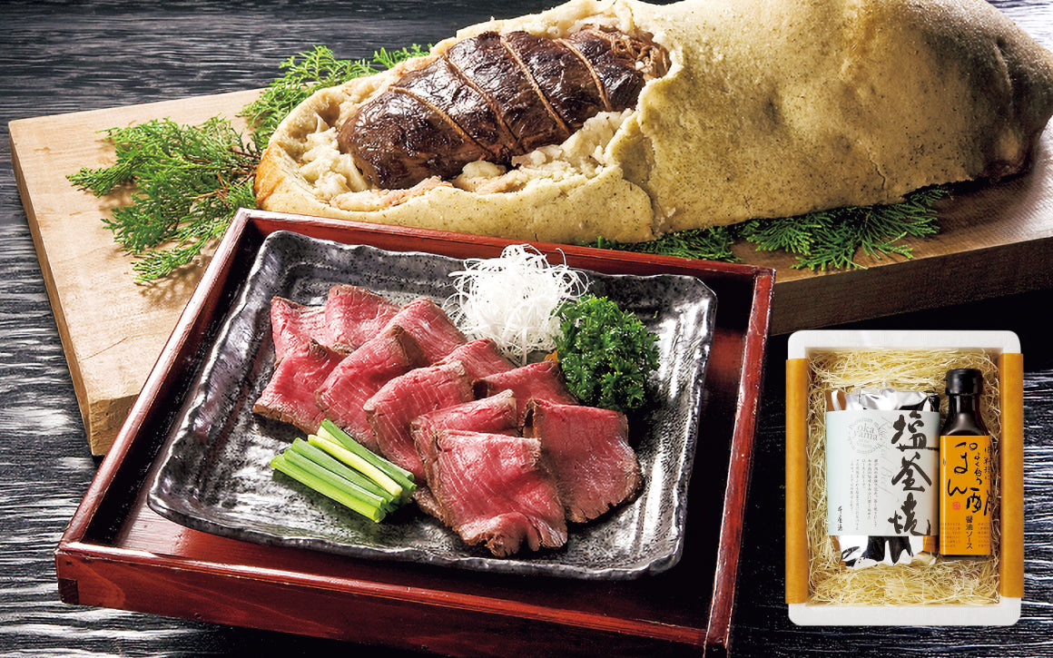 日本最古の蔓牛の血統を受け継ぎ、岡山県新見市で育てられた希少な千屋牛を使用した塩釜焼ローストビーフ。