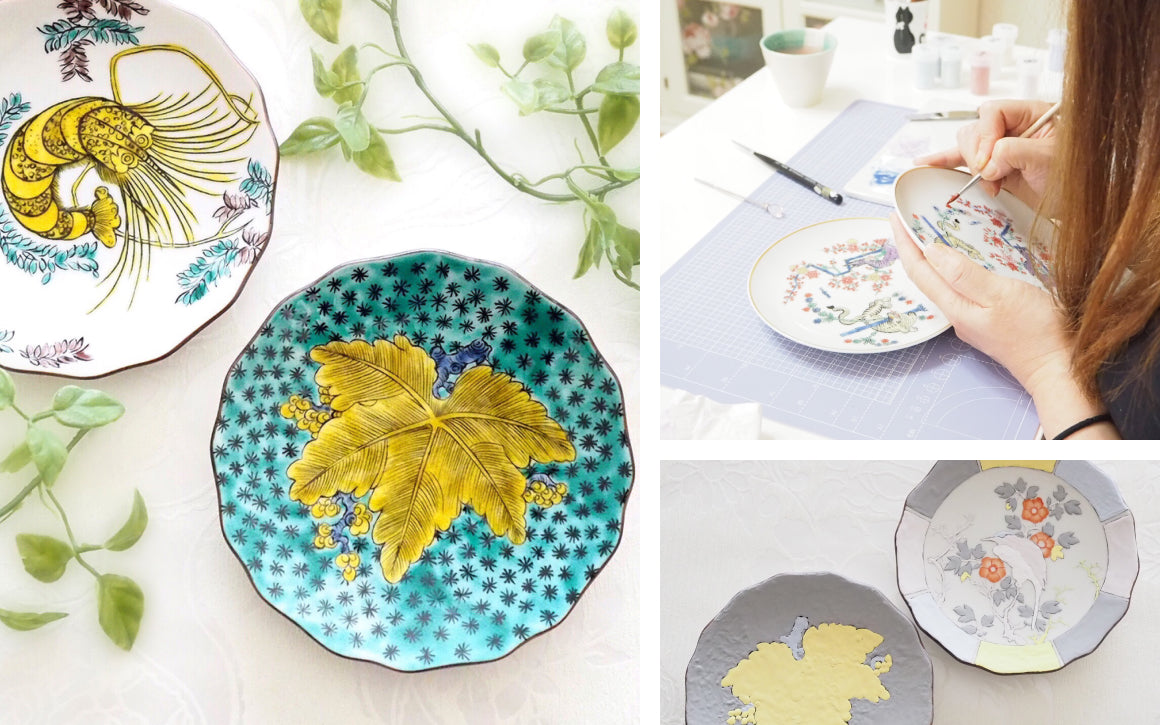 塗り絵感覚で気軽に描けるのでどなたでも本格的に仕上がりますよ。柿右衛門(有田)、九谷焼の絵柄からお好きな柄を選べます。出来上がった作品は、飾るだけでインテリアにもなります。