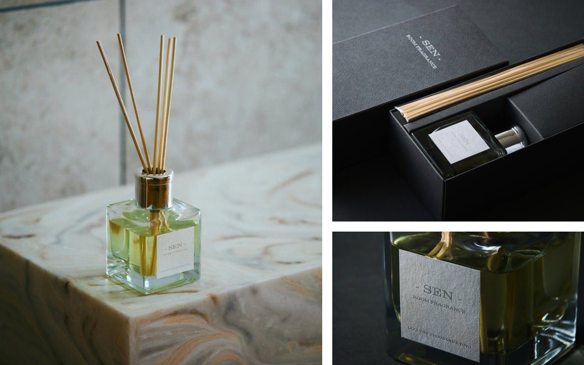 本ギフトでは、そんなホテルのイメージに合わせてヒノキやペパーミント、ベルガモットなどを調合したオリジナルアロマのリードディフューザーをお楽しみいただけます。