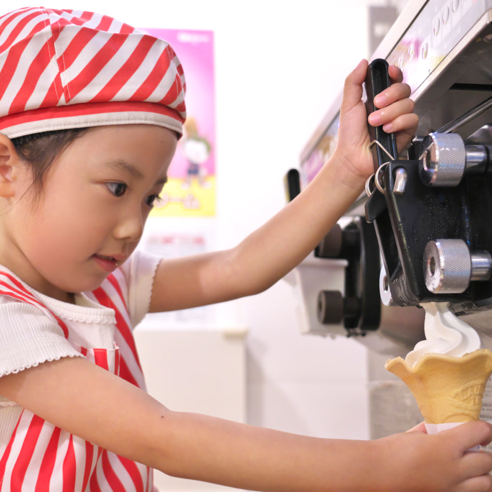 体験して作ったものや自身の活躍が収録されたDVDは「成果物」として持ち帰ることができます。また、作ったピザやソフトクリームなどの食べ物は、キッザニアの中で食べることができます。