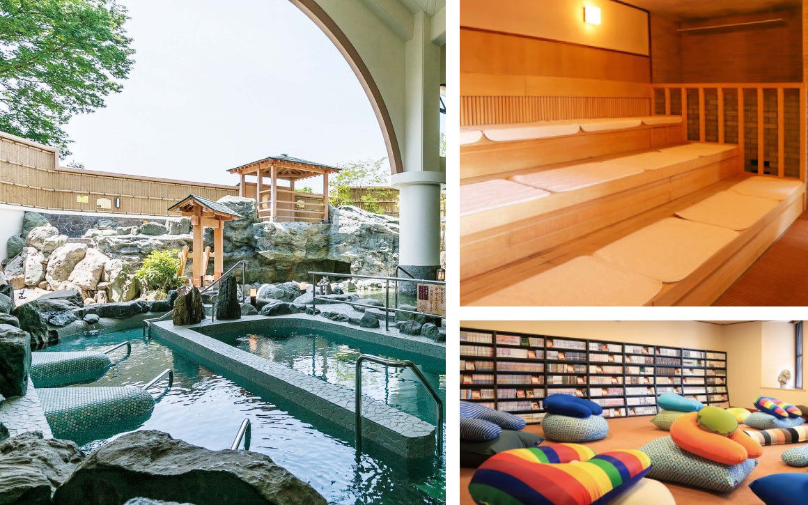 露天風呂には4種類の浴槽と蒸し風呂、大浴場には8種類の浴槽とサウナ・アカスリ、岩盤浴には6種類のエリア、その他リクライナールームなど、3つのゾーンに合計25種類のコンテンツを用意しております。