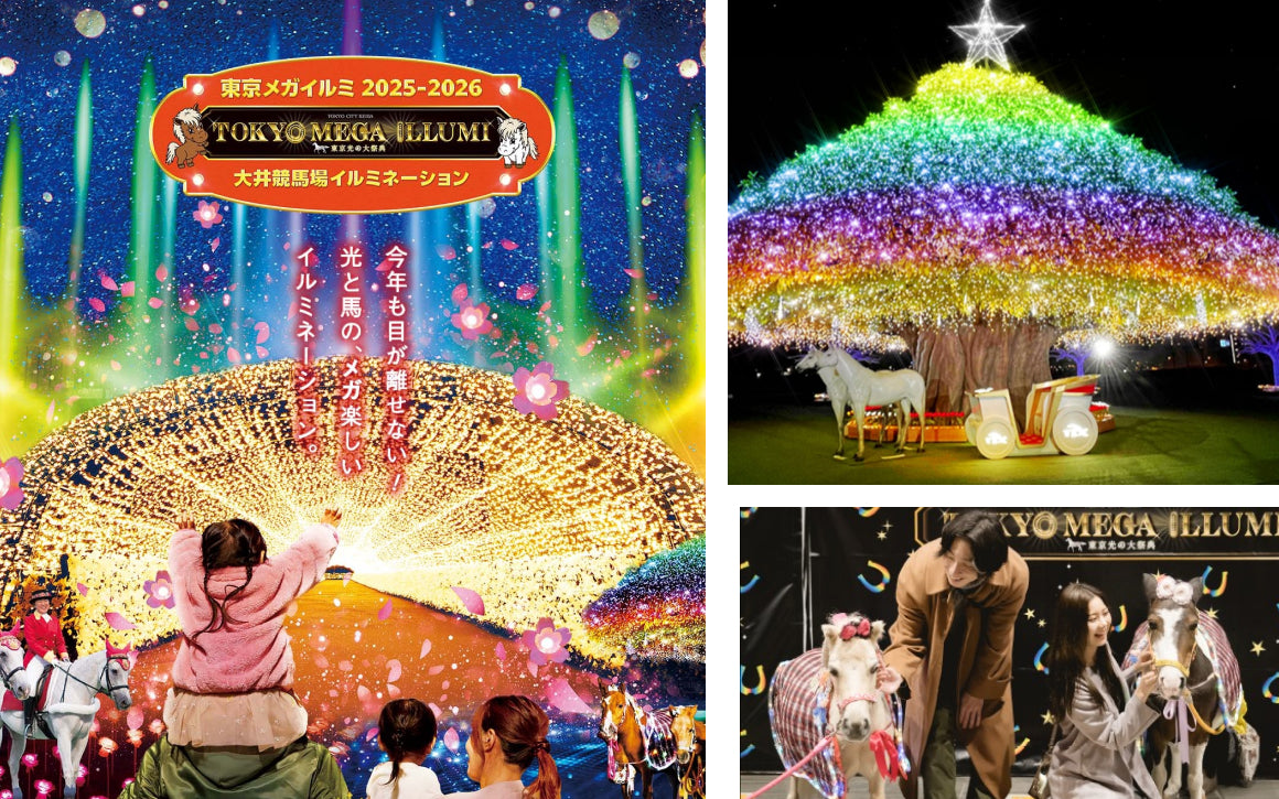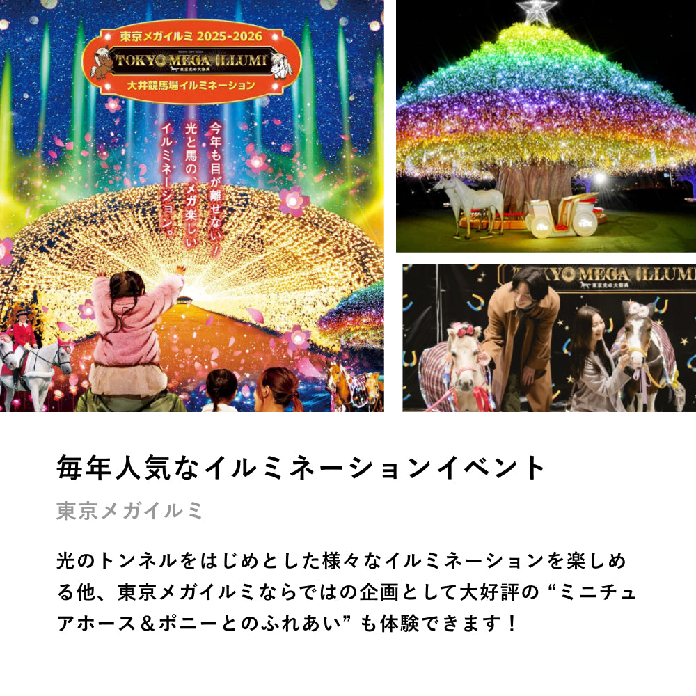 競馬のない日の大井競馬場(品川区)で開催している冬季限定イルミネーションイベントです。光のトンネルをはじめとした様々なイルミネーションを楽しめる他、東京メガイルミならではの企画として大好評の “ミニチュアホース&ポニーとのふれあい” も体験できます!