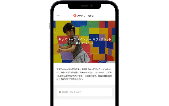 ご入館時にキッズパークレインボーフロントにてギフトチケット画面をご提示ください。 ※ギフトチケット1枚につきおとな1名、こども1名様の入館が可能です。 ※平日:終日遊べる親子チケットとしてご利用いただけます。 ※土日祝日:3時間パックの親子チケットとしてご利用いただけます。 ※営業時間等、施設の最新情報は公式HPにてご確認ください。 |