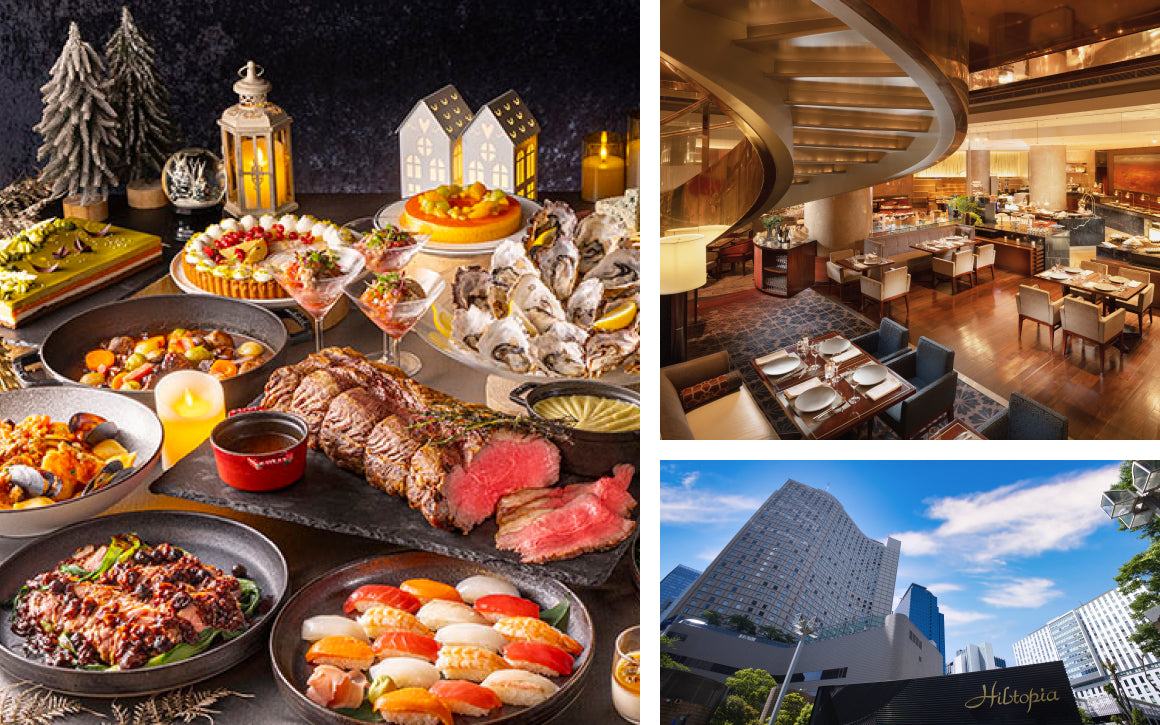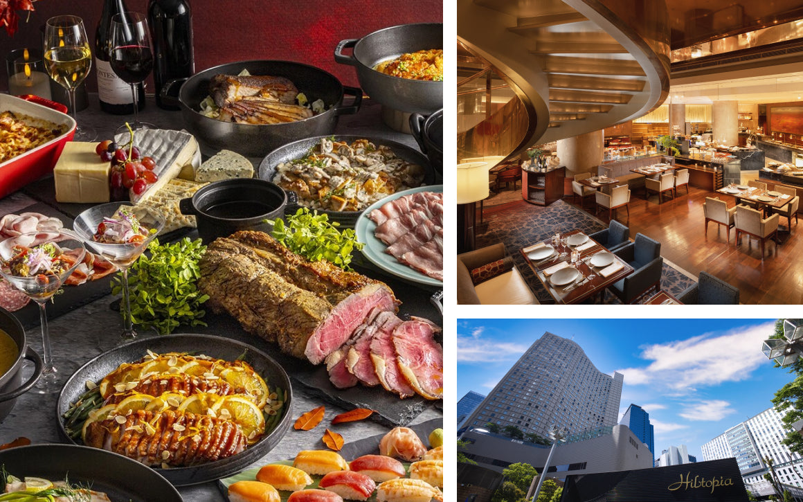 ヒルトン東京の1階に位置するラウンジのディナービュッフェ。モダンカラーのインテリアが並び、心地よい音楽が流れ、吹き抜けの開放感に包まれた、心から癒やされる空間。